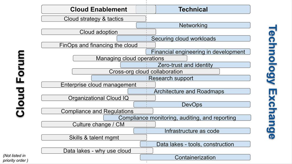 When Sarah Christen, director of IT infrastructure at Cornell University, created the Cloud Forum in 2015, the event was conceived as a gathering for strategic and leadership conversations around the use of cloud infrastructure in the unique framework of research and education institutions. The Cloud Forum underscored the need to make space for the broader spectrum of cloud conversations the research and education community wanted to have. These ranged from the deeply technical topics raised by the DevOps community to the all-important needs of the academic research community. For years, these conversations were only taking place at small gatherings of schools, token sessions at larger conferences, or through the grassroots efforts of individuals participating in the higher education Cloud Computing Community Group.