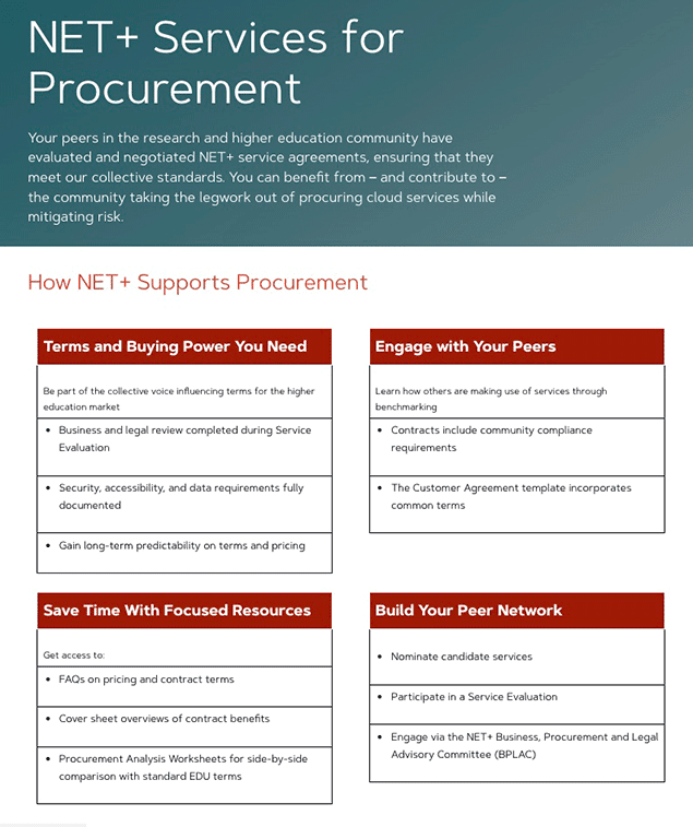 To support the procurement community further, we have recently updated our NET+ web page with new resources and information. You can now find a dedicated page for procurement professionals that provides an overview of the NET+ program, its benefits and value proposition, its governance and process, and its current portfolio of services. You can also find links to other useful resources, such as FAQs, webinars, case studies, testimonials, and contacts.