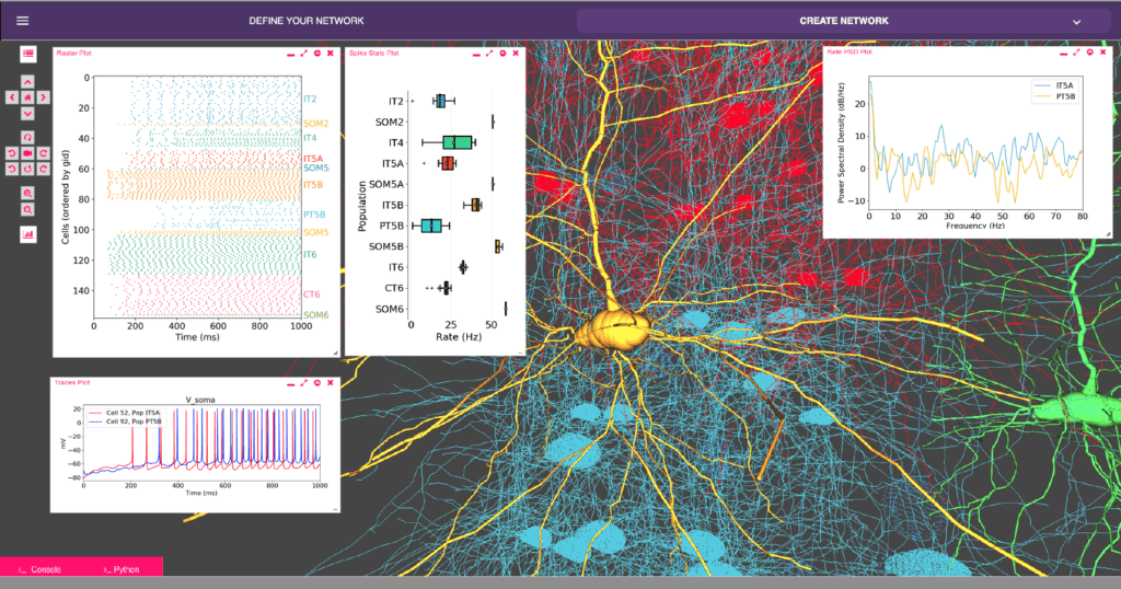 Fig. 1: Web-based graphical interface of multiscale brain circuit modeling tool (NetPyNE). The tool is hosted on GCP and integrated with the Open Source Brain Platform (netpyne.opensourcebrain.org). It is free to access for all students researchers who can build, simulate and analyze brain circuit models online (www.netpyne.org). [1–4]