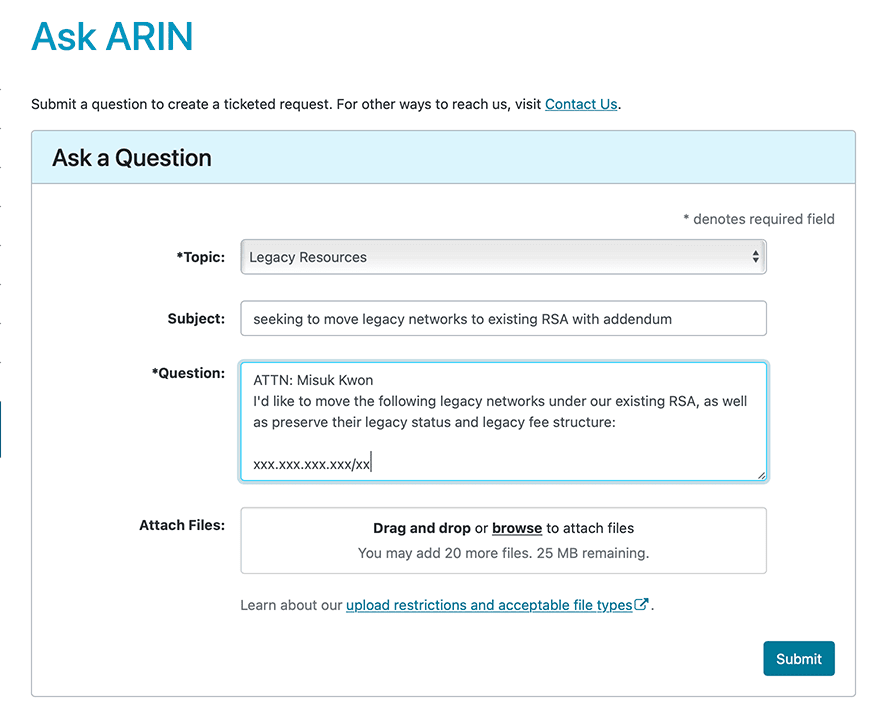 - In the Question: field, list the IP network(s) you wish to move to an existing RSA